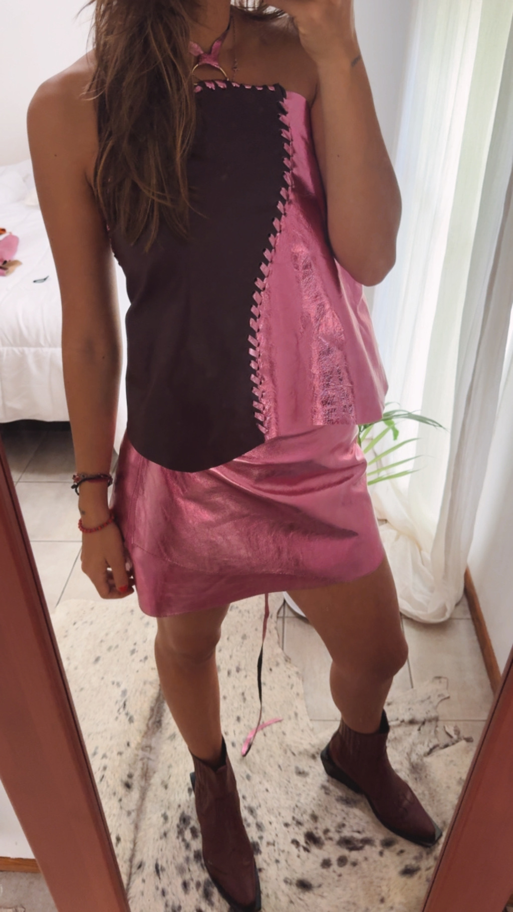 . Top con espalda descubierta. Es regulable por su manera de atar tanto en la espalda como en el cuello, el largo depende del corte natural del cuero por lo que CADA TOP ES DISTINTO.